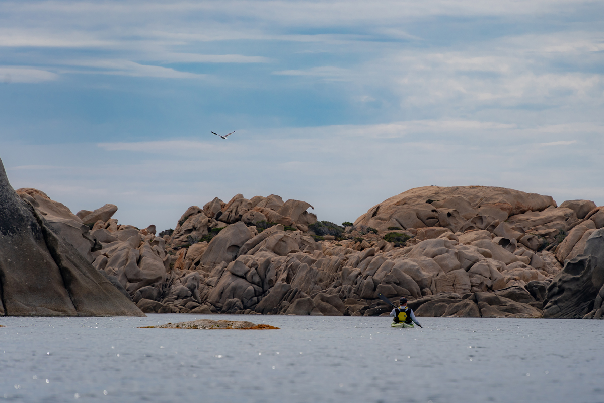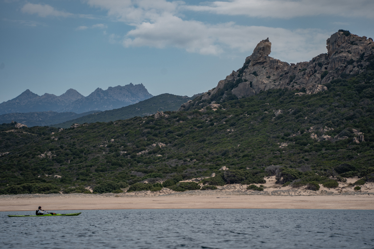 Bilder oben: Der Südwesten Korsikas ist sicher nicht ganz so spektakulär wie das Cap Corse oder der Nordwesten der Insel, doch was wir bei unserer Reise entdeckt haben, ist spektakulärer und zugleich lieblicher, als wir es uns vorgestellt haben. Hinter jedem Kap, hinter jeder Landzunge warten traumhafte Strände, die Strecken zwischen den Buchten sind überschaubar lang, was bei schlechtem Wetter und Sturm besonders wichtig für uns Seekajaker ist. Trotzdem sind die Stein- und Felsformationen einzigartig bizarr. Besonders spektakulär ist für uns die Mündung des Rizzanese, südlich von Propriano. Hier können wir einige hundert Meter vom Meer aus in den Fluss einfahren. Einer der zahlreichen Sandstrände nach dem “Plage de Tizzano” dient uns für diese Nacht als Quartier. Ein Strand ohne Verbotsschild, der in diesem Fall auch alternativlos ist, da jetzt, in der Vorsaison, die Campingplätze an diesem Teil der Küste noch geschlossen sind.