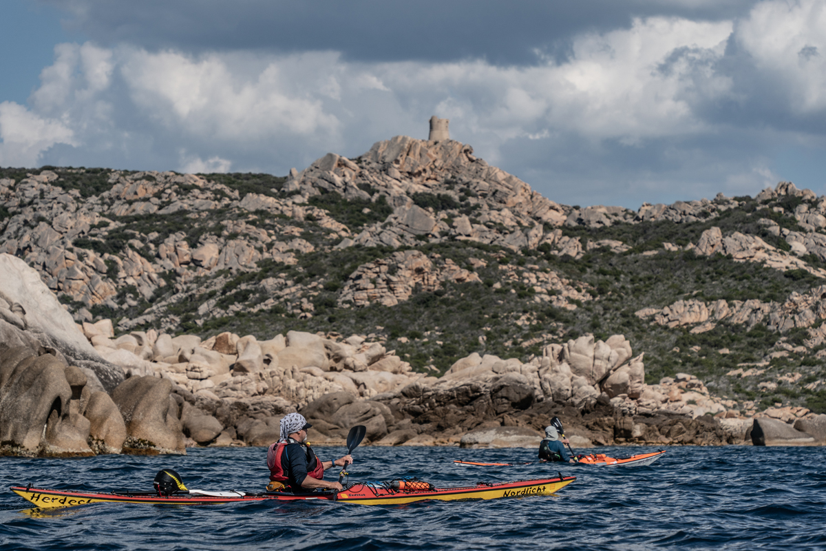 Bilder oben: Weiter im Süden wird die Küste noch schroffer und gibt den Blick auf die hohen Inselberge frei. Spektakulär sind auch die vielen Wachtürme, die sich an der Küste verteilen und den Eindringlingen bereits bei der Anfahrt die Wehrhaftigkeit der Korsen signalisieren. Erst für die nächste Nacht finden wir mit dem Camping Kévano wieder einen geöffneten Platz, der zwar leider nicht direkt am Strand ist, der sich aber trotzdem anbietet, da wir am recht verlassenen Beach unsere Boote ohne Bedenken liegen lassen und den kurzen Weg zum Camping laufen können. Wir verbringen hier einen stürmischen Tag, an dem wir nicht ins Kajak steigen, da Böen bis Stärke acht angesagt sind. Wir nutzen die gewonnene Zeit zum nachholen der Autos und zum entspannen. Der vorletzte Paddeltag treibt uns bis an die Steilküste bei Bonifacio. Doch extreme Böen, die immer stärker werden, zwingen uns aus Sicherheitsgründen zur Umkehr. Dank des zuverlässigen Wetterberichtes haben wir damit schon gerechnet, so hält sich die Enttäuschung in Grenzen und wir freuen uns über den Starkwind, der uns auf dem Rückweg zum Campingplatz ordentlich ins surfen kommen lässt. Am Abend greifen wir dann zum Plan B und fahren mit den Autos nach Bonifacio, um dort am Campinplatz unter zu kommen. Gott sei Dank haben wir vorher reserviert, denn im Gegensatz zum Rest der Insel, ist es hier schon ganz schön voll.