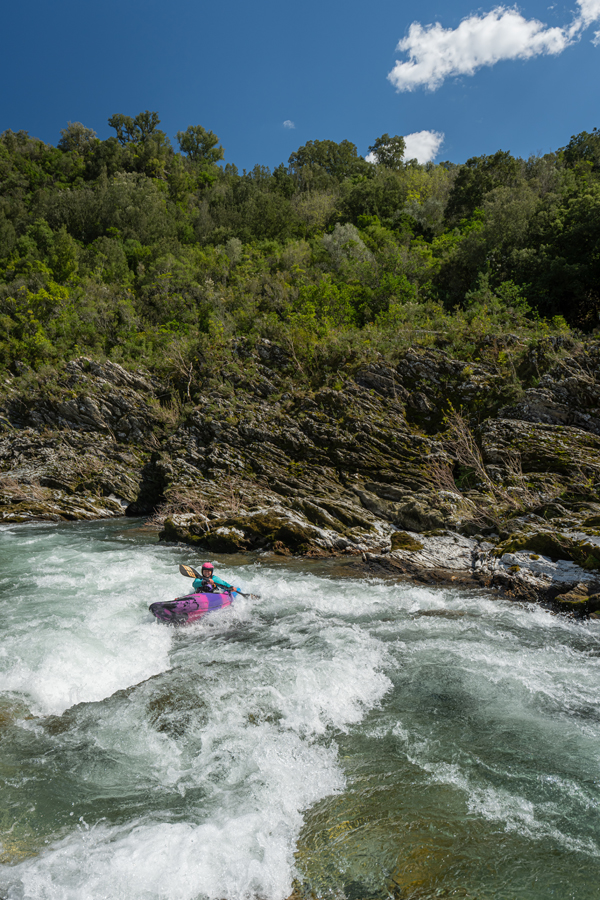 Der Tavigano, an dessen Ufer wir auf dem Campigplatz Ernella unser Lager errichten, entspringt im Zentrum der Insel und mündet bei Aléria ins Meer. Auf ihm kannst du dich ganz hervorragend einpaddeln und dich an die verblockten Flüsse der Insel gewöhnen. Zu allem Überfluss startet mit der Tavignano-Schlucht direkt am Campingplatz die schönste, aber auch spannendste Etappe des Tavigano, die für viele Paddler zu den Wildwasser-III-Highlights Korsikas zählt. Gut eingepaddelt warten weitere Klassiker auf uns, etwa der Golo, der genau wie der Tavignano ein ziemlich wassersicherer Kandidat ist und ebenfalls mit vielen Kilometern Wildwasser vom Feinsten auftrumpft. Auch einige Flüsse an der Ostküste sind von Camp Ernella aus gut zu erreichen, zum Beispiel der Travo, der Fium Orbo oder die Solenzara.